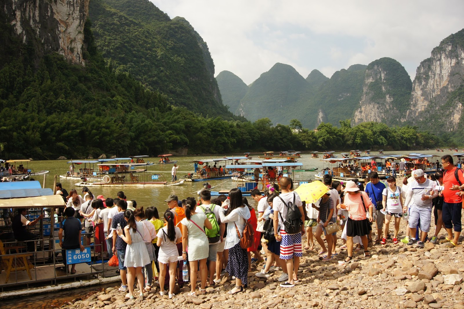 Viimeisenä päivänä lähdimme Li-jokiristeilylle, jonka oli tarkoitus viedä meidät seuraavaan kohteeseemme, Yangshuohon. Valitsimme hostellin järjestämän matkan, jossa bussi haki meidät hostellilta, ja kuljetti meidät tavaroinemme lautoille. Osa matkasta siis taitettiin lautalla, loppumatka Yangshuohon bussilla. Päädyimme bambulauttaan laivaristeilyn sijasta, mutta myöhemmin ajateltuna laivamatka olisi varmaan ollut parempi. Bambulautat Li-joella eivät nimittäin olleet ihan sitä, mitä odotimme... Ne oli tehty muovista, ja ne kulkivat moottorilla. Pään päällä oli katos, joka haittasi näkyvyyttä ja ennen kaikkea kuvien ottamista (omg!), ja lautta piti jakaa kahden muun turistin kanssa. Maisemat olivat kuitenkin upeat, siitä ei pääse yli eikä ympäri! Menisinkö toiste...? Enpä usko, mutta tulipahan koettua.