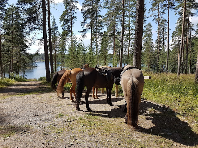 Olimme varanneet 2 tunnin maisemaratsastus-maaston, joka lopulta venyi lähes kolmetuntiseksi ilman lisäveloitusta. Ratsastimme Luston metsiköissä ja lopuksi harjualueella, jossa vietimme puolen tunnin levähdysatuon vaikuttavassa Valtiohotellissa (siis siinä samassa, jossa Putin oli käväissyt muutamaa päivää aiemmin). Meitä oli yhteensä vain kolme ulkopuolista ratsastajaa, mikä oli loppujen lopuksi tosi kiva ryhmäkoko, ja oli tilaa hölkytellä omaan tahtiin. Maaston vetäjä ja tallin pitäjä Soile oli ihan huippu, ja tallista jäi muutenkin tosi kiva vaikutelma. Pitää ehdottomasti mennä ensi kesänä uudestaan! Tein maastolenkistä videonkin, jonka kuvasin Goprolla. Video on tosi tylsä - tietedään. Miten sitä ei koskaan kuvatessa tajua millaista materiaalia kannattaa kuvata, että sitä olisi mielekästä katsoa... Huoh. Ehkä mä vielä joskus opin!